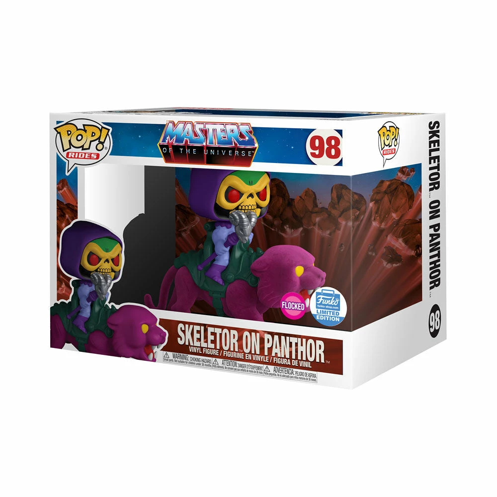 From the Masters of the Universe CartoonΒ comes this flocked Skeletor on Panthor Pop! Rides Figure! This is a limited edition exclusive figure.